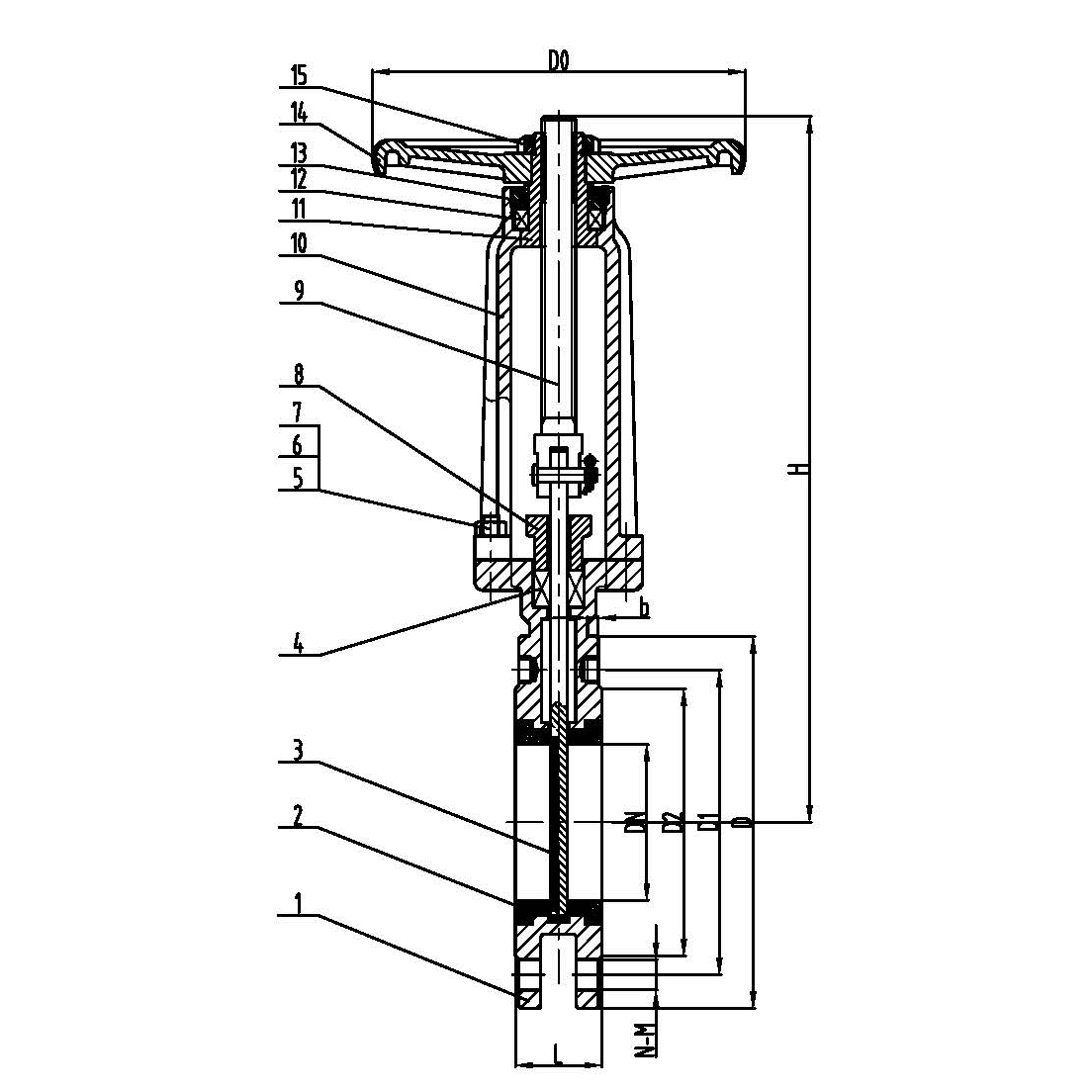 | DN | PN(kg) | L | D | D1 | D2 | H | n-d | D0 | b |